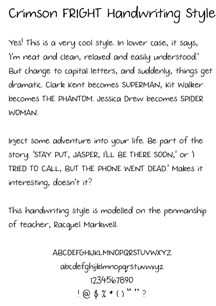 Here’s a link to a flipbook of the 64 page Crimson FRIGHT journal. This style is based on the handwriting style of Raquel Markwell, which was turned into a font. Isn’t it awesome?